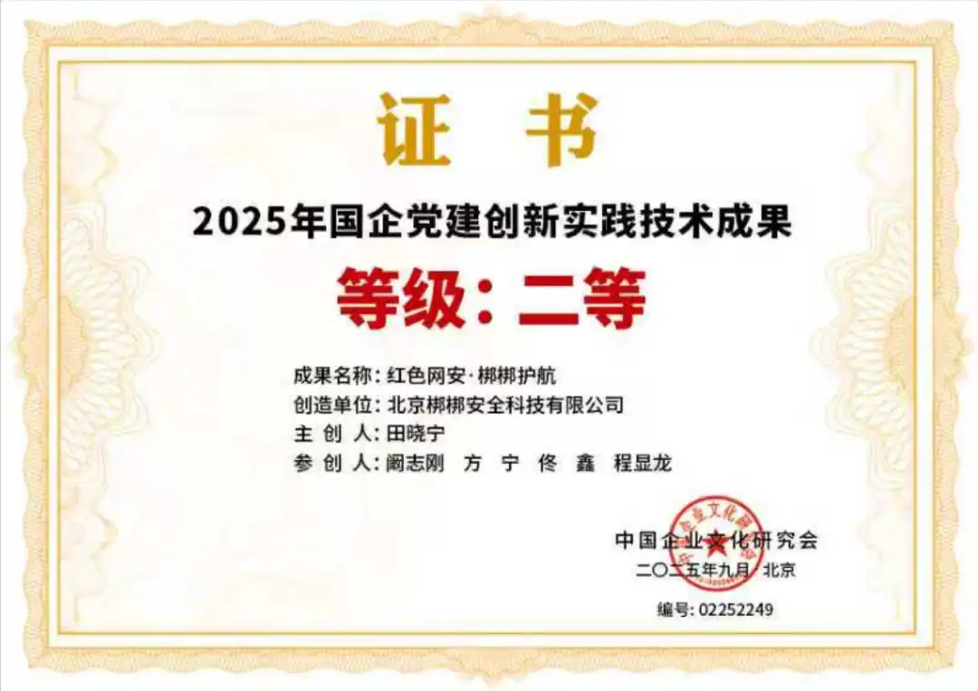 中国企业文化研究会在不断探索、深入研究党建与企业文化建设的理论创新和实践融合的背景下,面向全国开展“2025年国企党建创新实践成果”评选,旨在深入总结国企党建工作创新经验,扎实推进新时代、新征程国企党建创新工作发展,为企业高质量发展提供有力保障。本次共有来自全国范围的1000余项申报案例,经专家组审定,最终评选出创新成果356项,共设三个等级。北京梆梆安全科技有限公司(以下简称:梆梆安全)“红色网安·梆梆护航”党建品牌案例获评 “2025年国企党建创新实践技术成果” 二等等级。